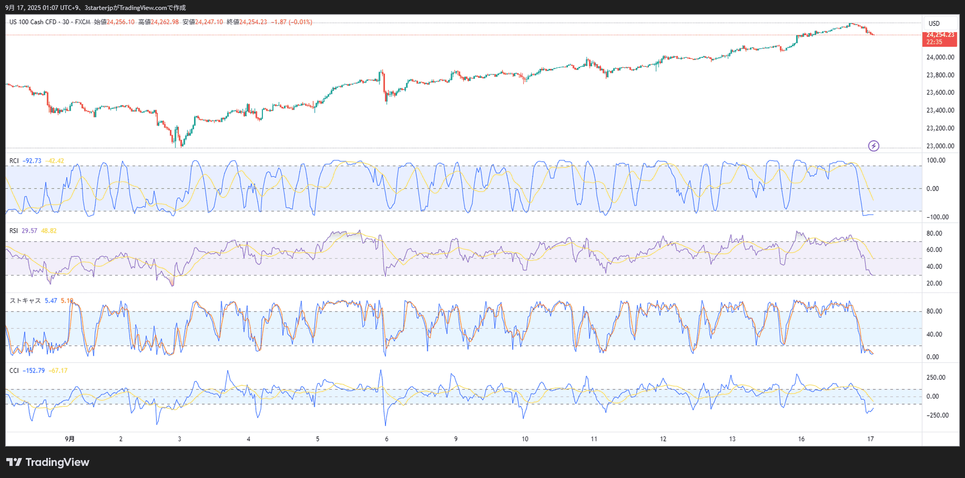 私がこの相場で利食いしたのは、チャート上の一番上の値位置です。※ナスダック2025/9/16、値位置はTradingviewで週末に配信済み。