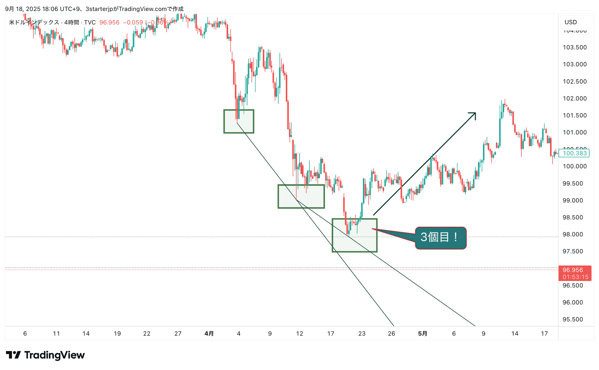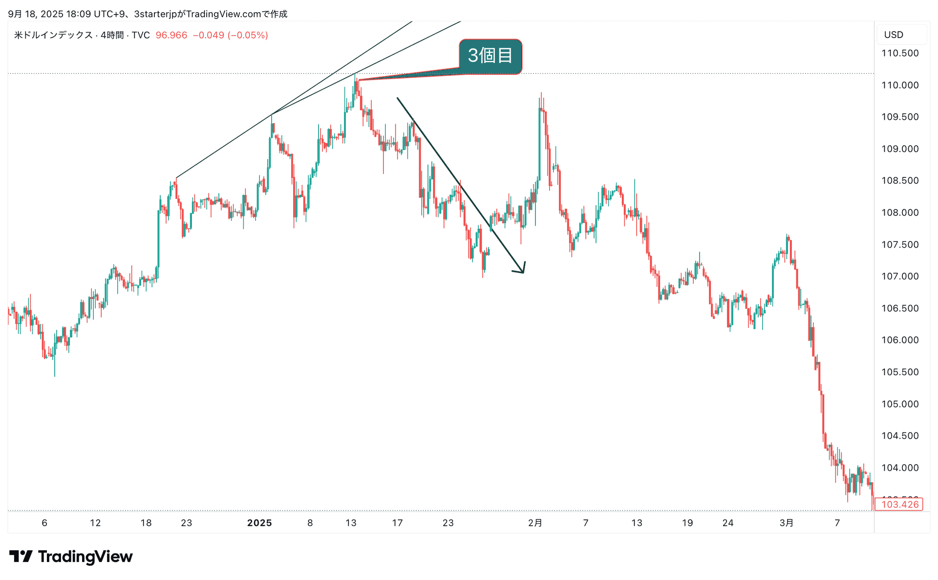 上の図は「3つ目の高値切り下げで売る」という方法です。
