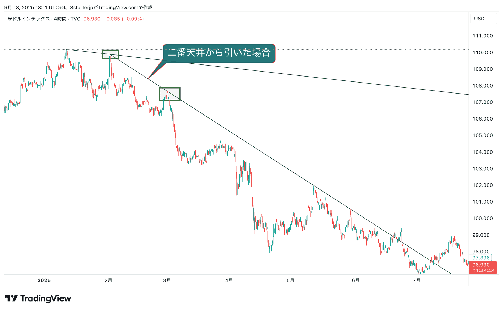 トレンドラインを二番天井から引いた場合と天井から引いた場合