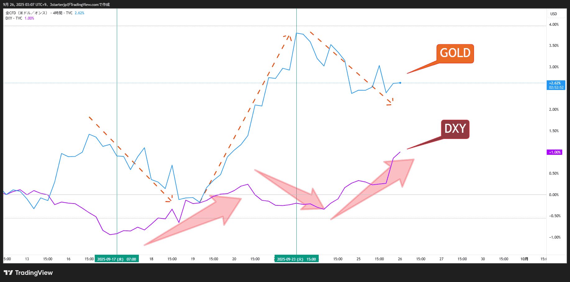 青とオレンジのラインが金相場(GOLD)。そして、ピンクがドルインデックス(DXY)です。