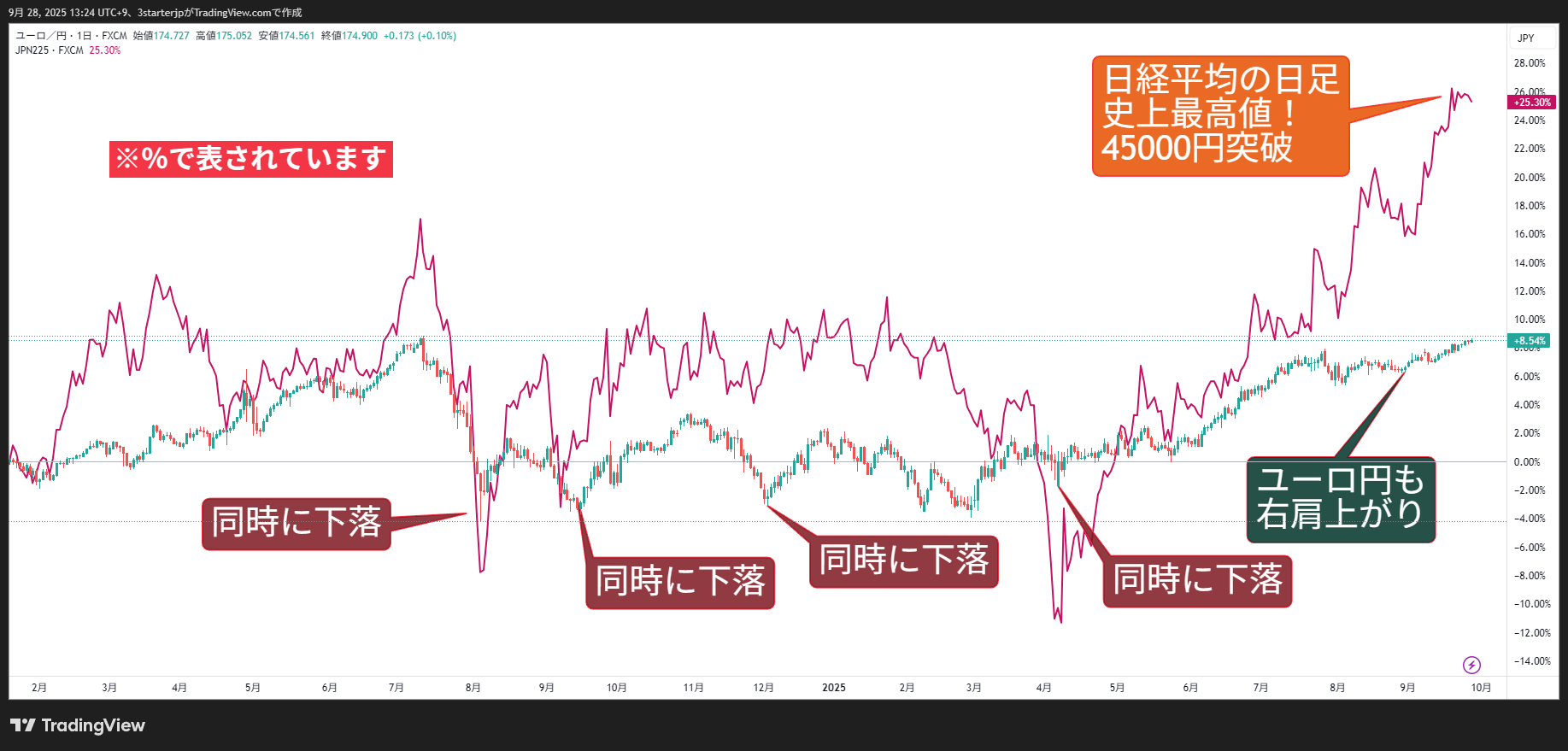 しかしクロス円は主に日経平均の値動きと同方向へ動きやすい傾向にあるため、下落しやすいのです。