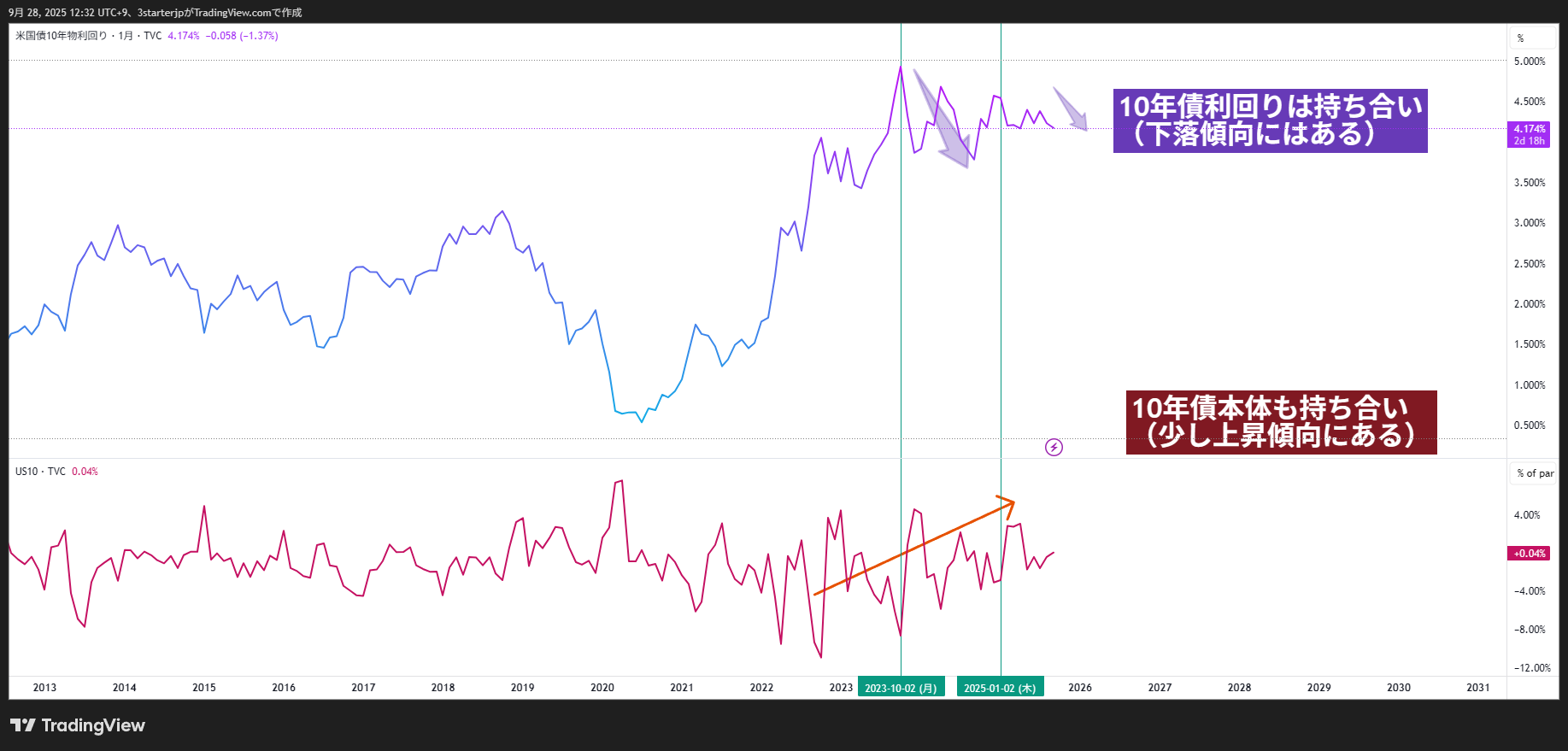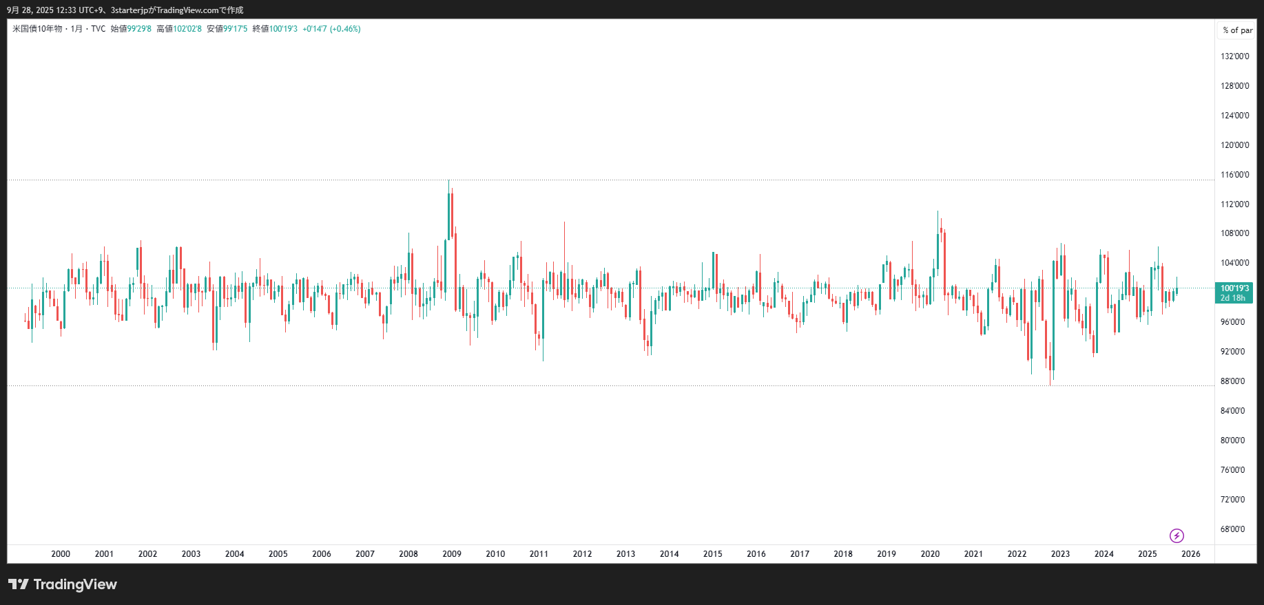 米国10年債の本体はほとんど動きません(笑)。見て頂くと分かるように、2000年~2025年までほぼ値位置が変わっていませんよね?