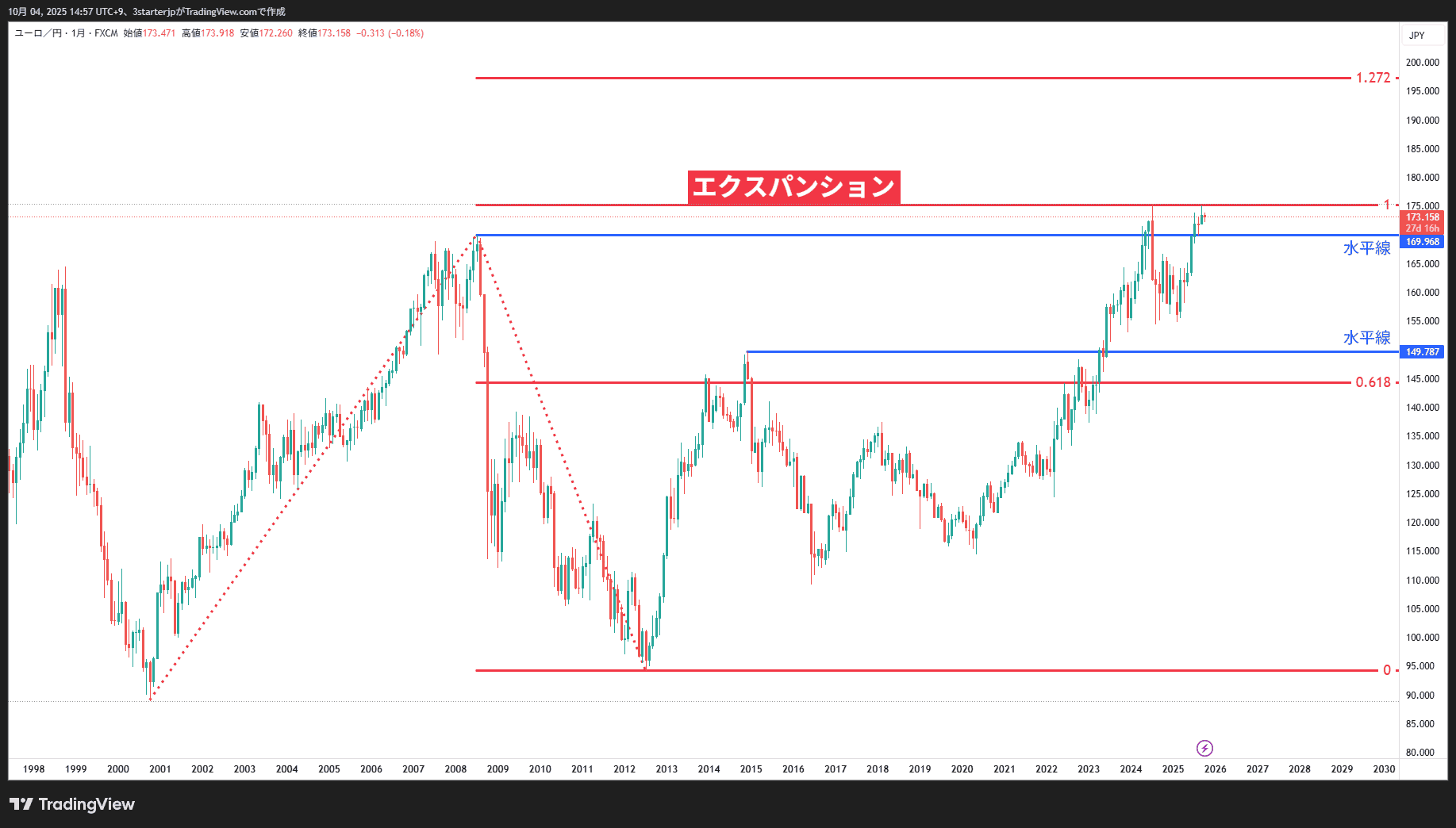 今回はエクスパンションの方が機能しているようです。これは月足のユーロ円チャートなので、これまでの全ての値動きを表します。よって、この規模でも機能するということは相場においていかに重要な値位置なのかを意味していると言えるでしょう。