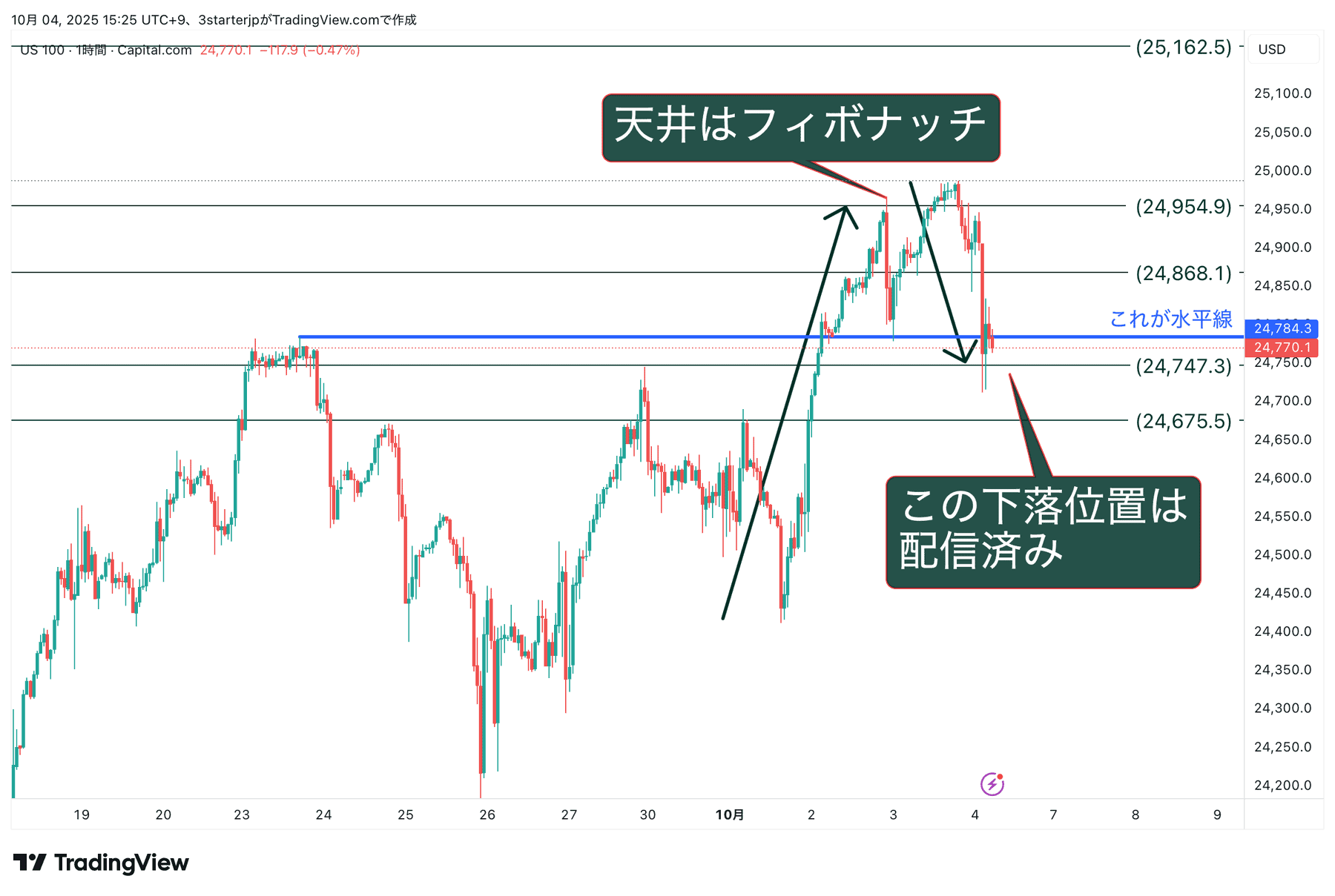 上の図(ナスダック100の1時間足)はフィボナッチを緑、水平線を青で表してあります。