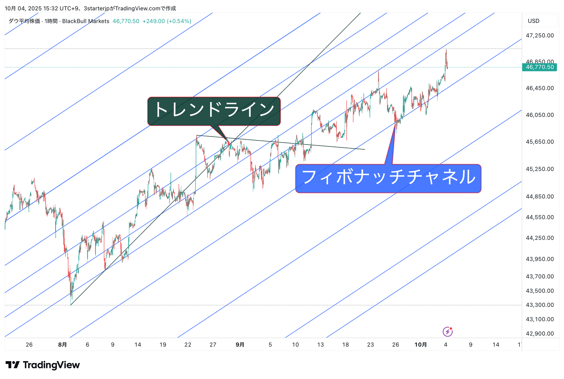 - トレンドラインは底と2番底、天井と2番天井に引いてあります。